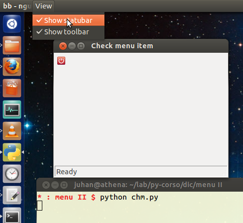 Quando vogliamo sapere se un'opzione è attiva o no e vogliamo gestirla con un menu possiamo usare i check menu, eccone un esempio (chm.py):